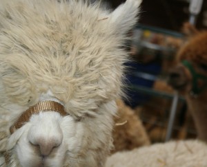 Alpacas, which produce a soft and lovely fiber, are on site at the Fiber Festival of New England in West Springfield Mass. – this weekend. Held inside the Mallary Complex, more than 200 vendors will exhibit their wares – and other fiber animals include sheep, rabbits, llamas. Photo by Chris Brunson for Moo Dog Knits, all rights reserved.